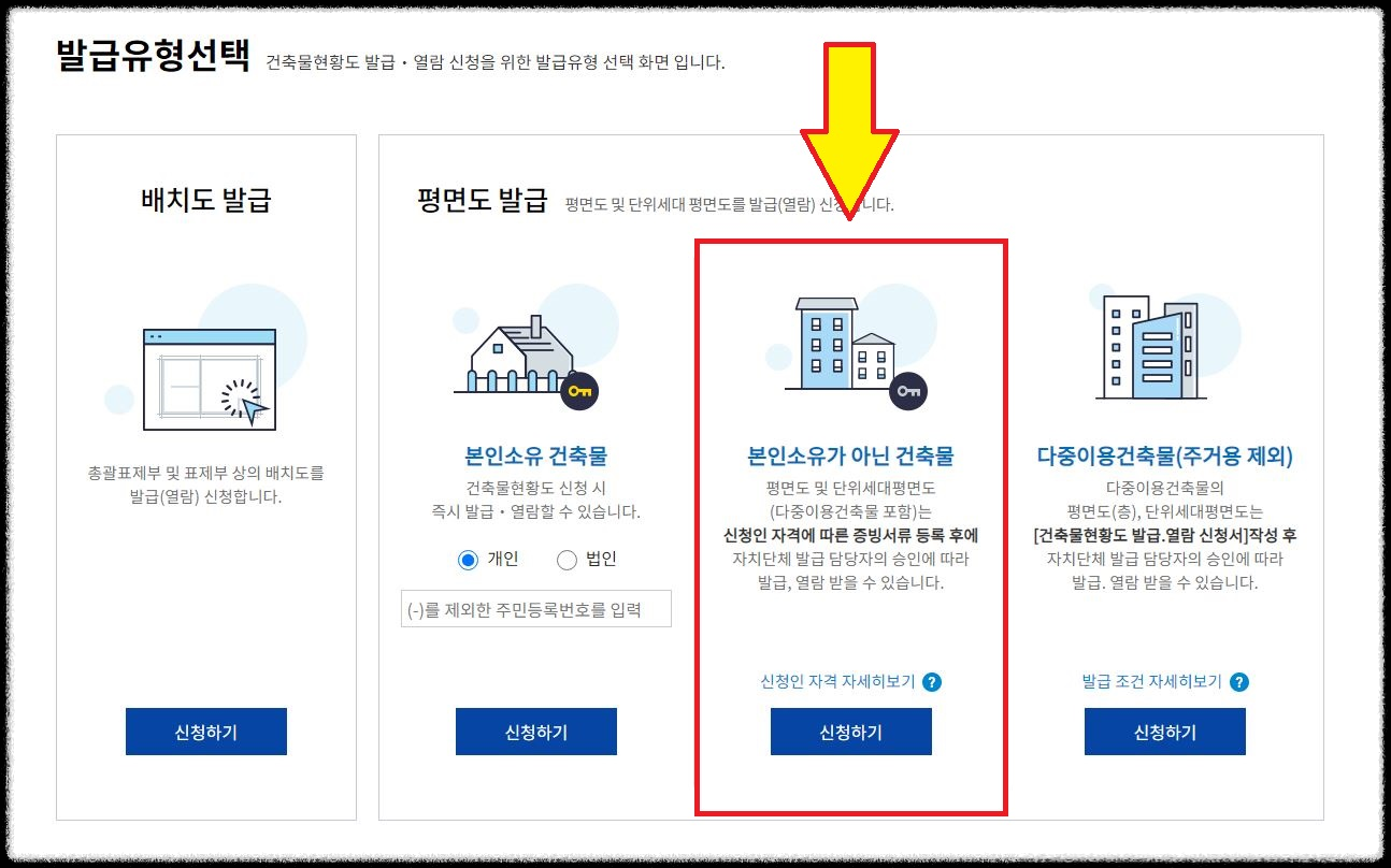 ⑤ 우리는 열람이 아닌 발급을 원하므로, '건축물 현황도를 발급합니다.'를 선택합니다.