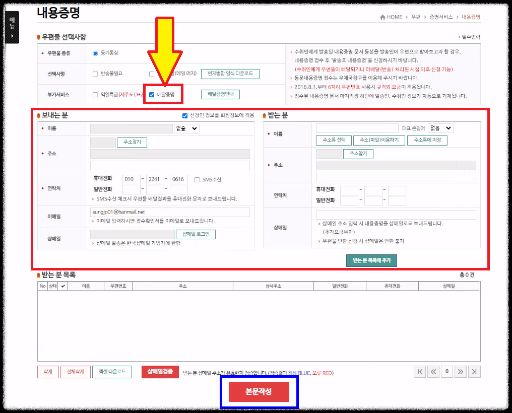 ② '배달증명' 부분을 체크(추후 내용증명서 도착에 대하여 확인 가능)하고, 나머지 내용을 작성합니다.