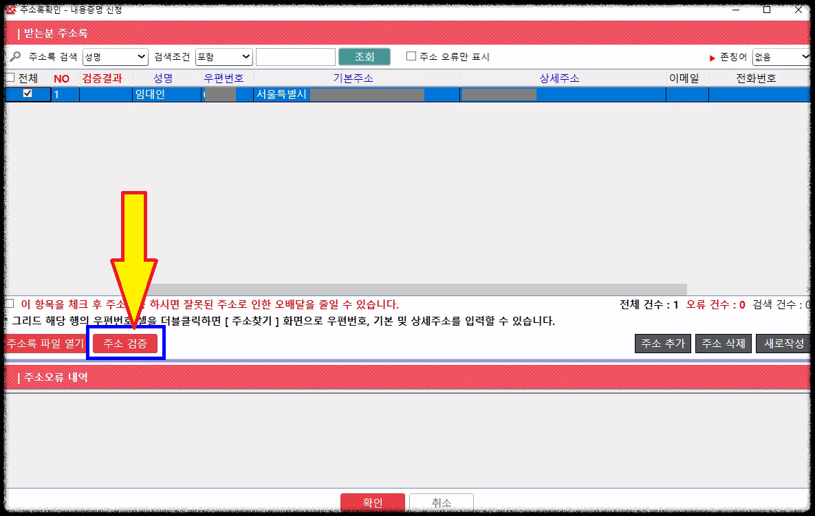 ⑤ 상단에 '03 미리보기' 버튼을 클릭한 후, '주소검증'까지 해줍니다.