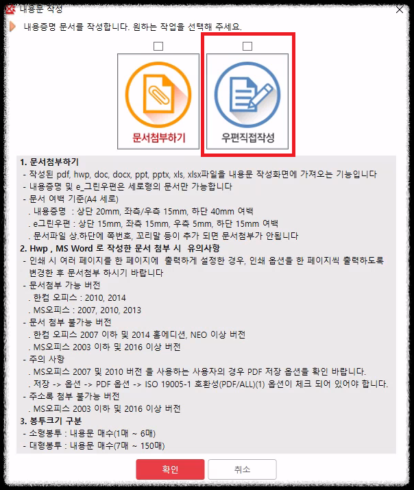 ③ '문서첨부하기' 또는 '우편직접작성' 원하는 걸 선택하시면 됩니다. 저는 '우편직접작성'을 선택해 보겠습니다.