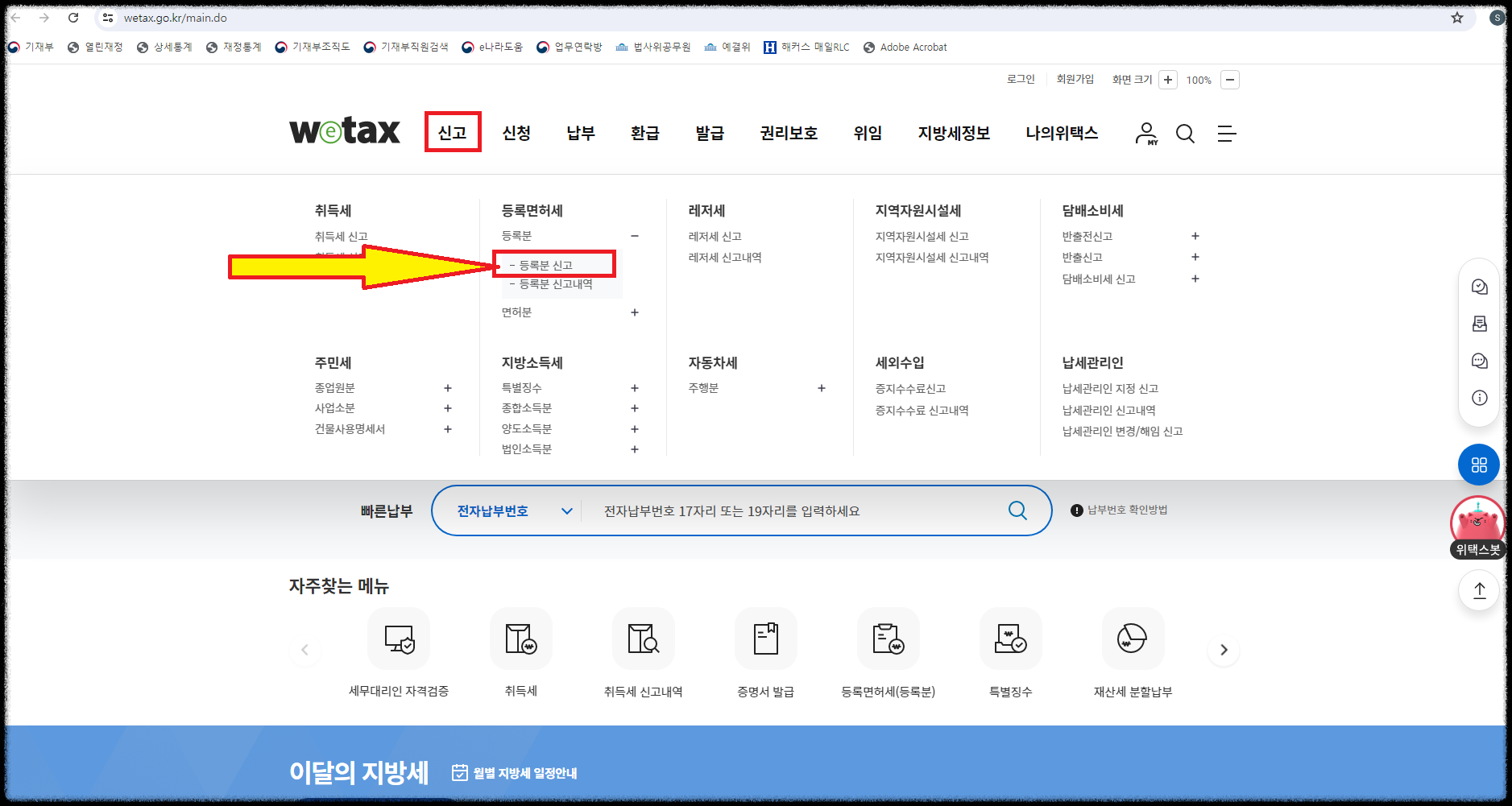 ① 위택스 홈페이지(https://www.wetax.go.kr/main.do)에 접속하여, '등록분 신고'를 클릭합니다.