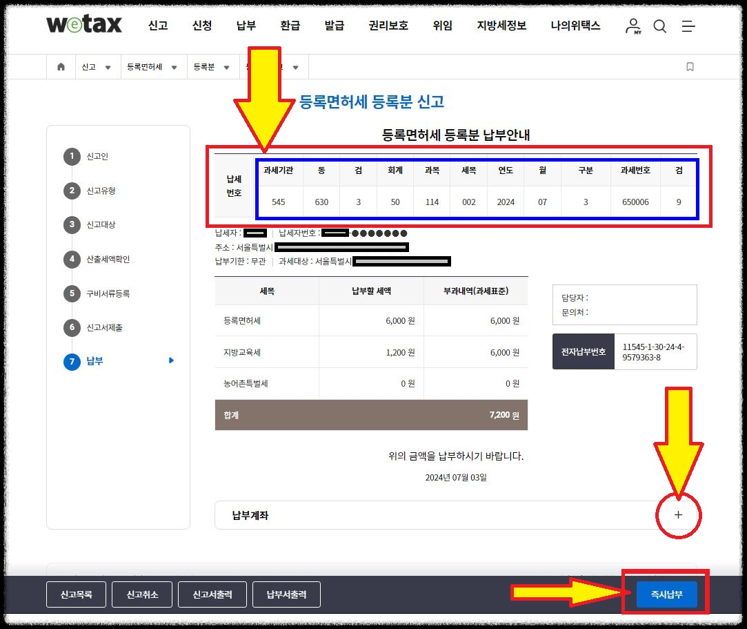 세번째, 오른쪽 하단 '즉시납부'를 통해서 등록면허세를 바로 납부할 수도 있습니다.